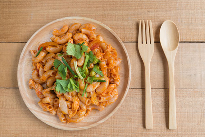- ต้มน้ำให้เดือดใส่มะกะโรนีลงไปต้มประมาณ 5 นาที เสร็จแล้วแช่ทิ้งไว้ในน้ำร้อนประมาณ 5 นาทีจนนิ่ม ตักขึ้นใส่ตะแกรงพักให้สะเด็ดน้ำ