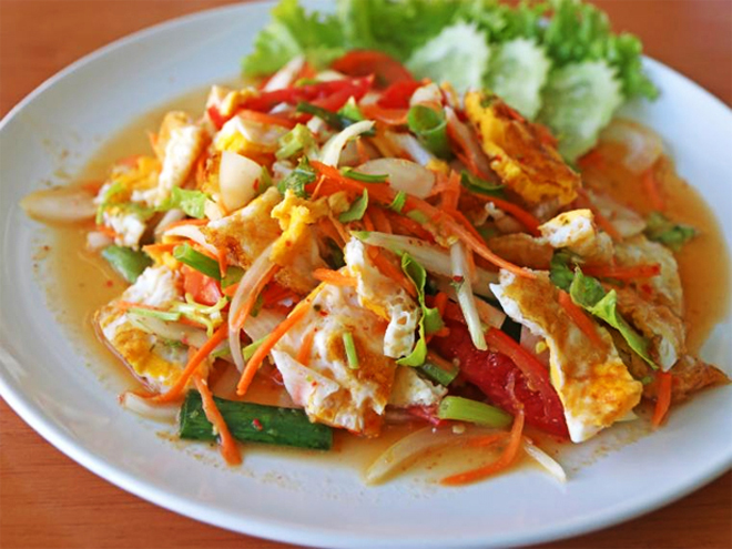 4. เมื่อได้น้ำยำแล้วจึงค่อยใส่พริกขี้หนูสับ ต้นหอม ผักชี ลงไปผสม คลุกเคล้าให้เข้ากันแล้วนำไปตักราดบนไข่ที่เตรียมเอาไว้
