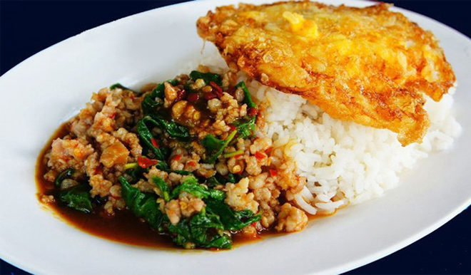 - ตบท้ายด้วยการใส่ใบกระเพราลงไปแล้วตักขึ้นใส่จานเสิร์ฟได้เลย