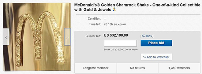 แมคโดนัลด์ได้ เปิดประมูลถ้วยทองคำ สุดหรู โดยใบหนึ่งมีการเปิดประมูลและอีกใบหนึ่งเป็นการแจกฟรีเพื่อฉลองการครบรอบ 50 ปี Shamrock Shake
