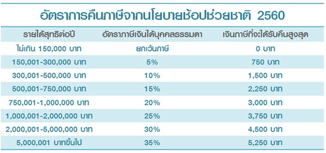 ขึ้นอยู่กับฐานภาษีของตัวเอง เช่น ผู้ที่มีฐานภาษี 35% หากซื้อสินค้าไป 15,000 บาท เมื่อนำไปคำนวณค่าลดหย่อนตอนยื่นแบบภาษีเงินได้บุคคลธรรมดาแล้ว จะได้ภาษีคืนถึง 5,250 บาทเลยทีเดียว เท่ากับว่าซื้อสินค้าแบบมีส่วนลดถึง 35% ซึ่งเป็นอัตราคืนภาษีสูงสุดของนโยบายนี้ ขณะที่ผู้ที่มีฐานภาษี 5% หากจ่ายซื้อสินค้าไป 15,000 บาท ก็จะได้ภาษีคืนเพียง 750 บาทเท่านั้น หรือได้ส่วนลดจากการซื้อสินค้าแค่ 5%