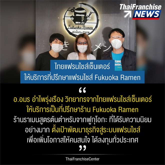 โดยล่าสุด อาจารย์ อมร อำไพรุ่งเรือง วิทยากรผู้มีความรู้และประสบการณ์ในธุรกิจแฟรนไชส์มายาวนานได้ให้ความรู้และเป็นที่ปรึกษาแก่ร้าน Fukuoka Ramen ซึ่งเป็นร้านราเมนสูตรต้นตำหรับจากฟูกุโอกะที่ปัจจุบันมี 2 สาขาคือบางแสน