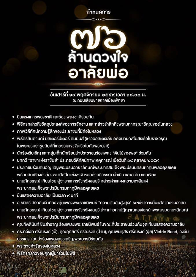 ณ.ชายหาดพัทยา โดยจะทำการปิดถนนเลียบชายหาด ตั้งแต่ถนนพัทยาเหนือ จรด ถนนพัทยาใต้ เพื่อร่วมร้องเพลงสรรเสริญพระบารมี เพลงพระราชนิพนธ์ต่างๆ และร่วมจุดเทียนความอาลัย ร่วมกับผู้ว่าราชการจังหวัด, วงจีบ กรุงเทพ และอ.ธนิสร์ ศรีกลิ่นดี