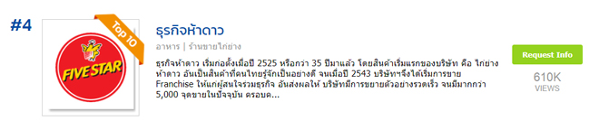 ยังคงรักษาความแรงของธุรกิจได้อย่างต่อเนื่องเป็นแฟรนไชส์ยอดนิยมที่ติดอันดับมาตั้งแต่ปี 2560 ที่ผ่านมาในปีนี้ก็ติดอันดับที่ 4 จากจำนวนผู้เข้าชมข้อมูลแฟรนไชส์ถึง 609,000 ครั้ง ด้วยเอกลักษณ์ของแบรนด์ที่คนไทยคุ้นเคยกันเป็นอย่างดีอยู่คู่สังคมไทยมานานกว่า 35 ปี ปัจจุบันมีสินค้าภายใต้แบรนด์ห้าดาวมากมาย