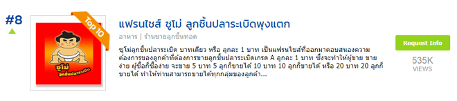 www.ThaiSMEsCenter.com จึงได้จัดอันดับ 10 แฟรนไชส์ยอดนิยมวัดผลจากการเข้าชมข้อมูลของคนทั่วไปที่สนใจอยากหาแฟรนไชส์ลงทุน มีแฟรนไชส์ไหนที่น่าสนใจบ้างตามไปดูกัน