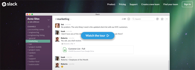 Slack คือ แอพการสื่อสารกลุ่มในองค์กรที่สามารถ chat หรือ แชร์ code snippets, ไฟล์ภาพ, วิดีโอ, ลิงก์ อีกทั้งยังโพสต์โต้ตอบกันเหมือน social network นอกจากนี้ยังสามารถทำห้องหรือ hashtag เพื่อคุยในแต่ละ channel หรือเรื่องงานที่ตัวเองเกี่ยวข้องนั้นได้ และ Tag ทีมงานที่เกี่ยวข้องได้อีก