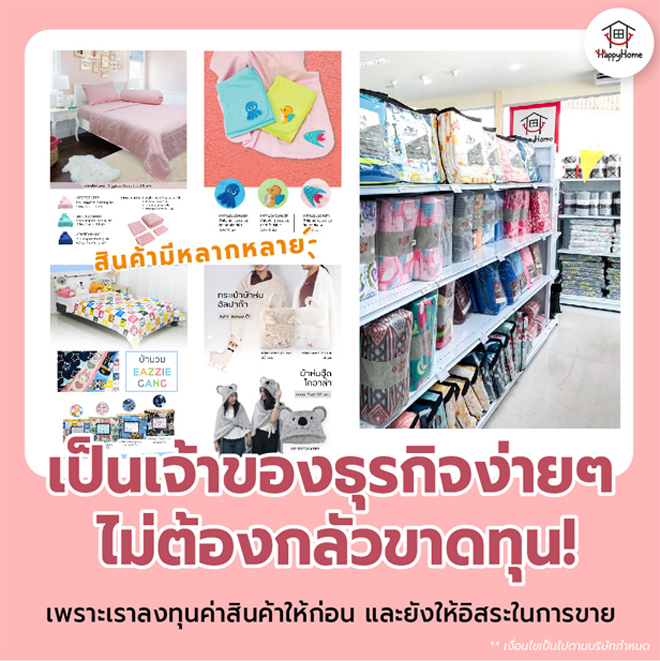 แฮปปี้โฮม ธุรกิจแฟรนไชส์ประเภท สินค้า Home Textile ภายใต้การบริหารงานของบริษัท แฟชั่น โฮมเท็กซ์ ซึ่งเป็นกลุ่มธุรกิจที่ดำเนินงานอยู่ในเครือของบริษัท จงสถิตย์ โรงงานผลิตสิ่งทอชั้นนำ ที่มีประสบการณ์กว่า 70 ปี มอบโอกาสให้คนที่เบื่อการทำงานประจำ หมดไฟไม่อยากทำงานแบบเดิมสู่ธุรกิจของตัวเองในรูปแบบ แฟรนไชส์ฟรีลงทุนสำหรับลูกค้าใน กทม.และปริมณฑล โดยเป็นการนำสินค้าจำพวก Home Textile เช่น ผ้าห่ม ตุ๊กตาผ้าห่ม ชุดเครื่องนอน ผลิตภัณฑ์สำหรับเด็ก นอกจากนี้ยังมีสินค้า Recycle 100% ที่ผลิตมากจากขวดพลาสติก อีกมากมายหลายรายการนำไปจำหน่ายสร้างรายได้ทุกช่องทาง หรือสามารถนำสินค้าไปจำหน่ายร่วมกับสินค้าอื่นเป็นโอกาสในการสร้างรายได้ที่ดีในยุคนี้ การันตีความเป็นสุดยอดแฟรนไชส์ด้วยการออกสื่อมากมายหลายแขนง