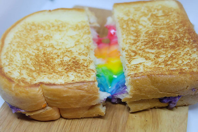 - เมื่อกลับด้านที่ปิ้งขึ้นให้นำชีส ที่ใส่สีไว้มาวางบนหน้าขนมปัง แล้วนำอีกแผ่นที่พักไว้มาวางทาบไว้