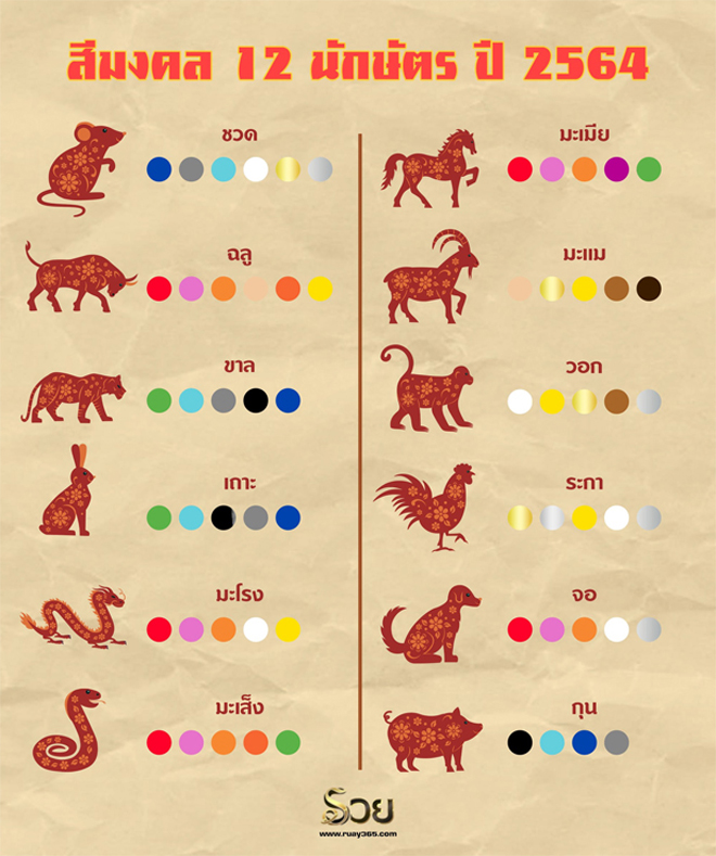 สีมงคลประจำ 12 นักษัตร ในปี 2564 จะช่วยเสริมดวงชะตา เสริมความร่ำรวยได้ ซึ่งเชื่อว่าการเลือกใช้สีที่ถูกโฉลกจะนำแต่ความมงคลเข้ามาในชีวิต โดยสีมงคลเหล่านี้สามารถนำไปเลือกใช้กับสิ่งของในชีวิตประจำวันได้เช่น สีเสื้อ สีรถ วอลเปเปอร์ เคสโทรศัพท์ เป็นต้น โดยสีมงคลประจำ 12 นักษัตรได้แก่