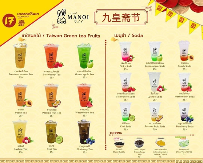 เทศกาลกินเจปีนี้สามารถอร่อยกับเมนูเครื่องดื่มของแฟรนไชส์มาโนอิที่จัดให้! กับหลากหลายเมนูเครื่องดื่มสุดว้าว ที่การันตีว่าอิ่มบุญ! อิ่มใจ! เลือกเมนูไหนก็อร่อยถูกใจทั้งนั้น เช่น ชามะลิพรีเมียม , ชาแอปเปิ้ลเขียว , ชาพีช , ชาเสาวรส,ชาแตงโม , กีวีโซดา , ลิ้นจี่โซดา , แตงโมโซดา เป็นต้น และยังมีอีกหลายเมนูที่พร้อมให้ลูกค้าสดชื่นต้อนรับเทศกาลกินเจ