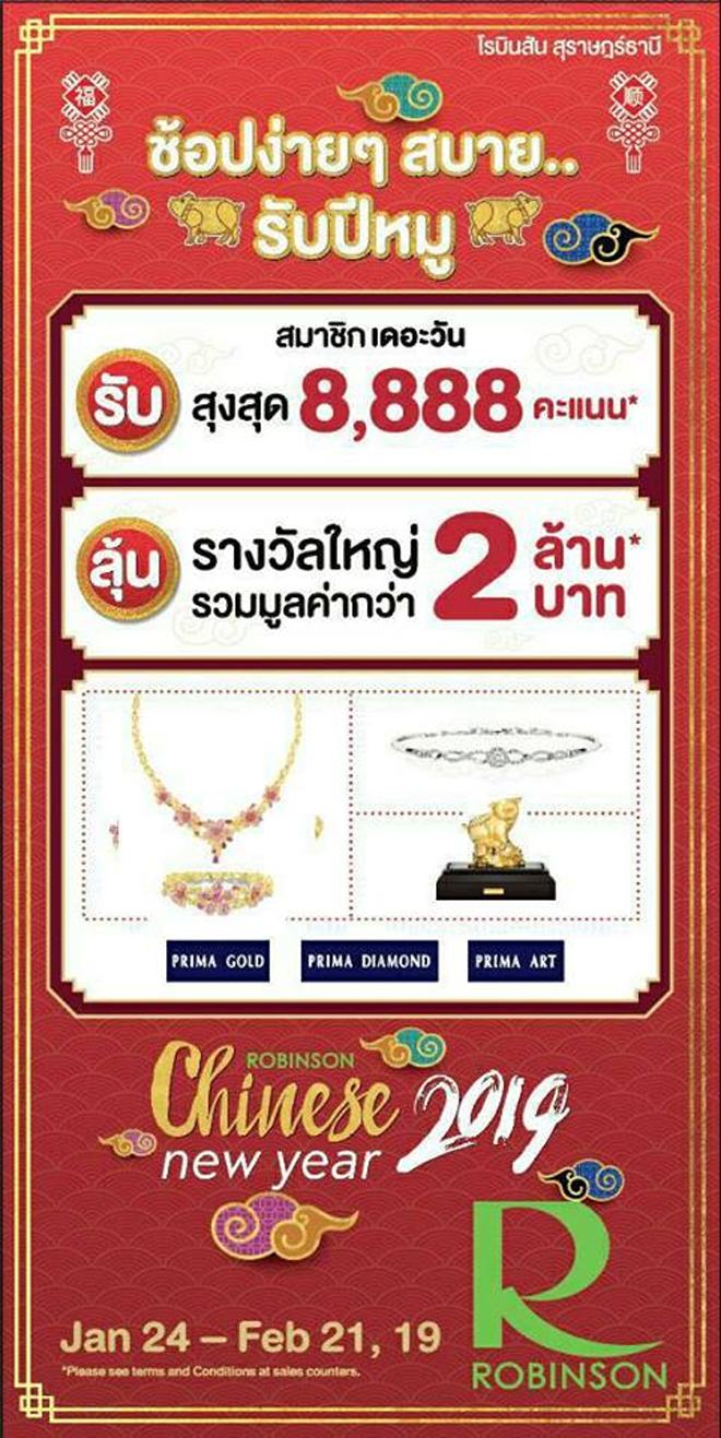 โรบินสันทุ่มงบกว่า 15 ล้าน สู้ศึกตรุษจีนปีหมูที่คาดว่าหลากหลายธุรกิจค้าปลีกจะมีการงัดกลยุทธ์มาแข่งขันกันอย่างดุเดือด ทั้งในแง่ของสินค้าคุณภาพที่ครบครัน รวมไปถึงรายการส่งเสริมการขายที่โดนใจ เพื่อช่วงชิงกำลังซื้อนักชอปด้วย 2 แคมเปญใหญ่ “ROBINSON CHINESE NEW YEAR 2019”