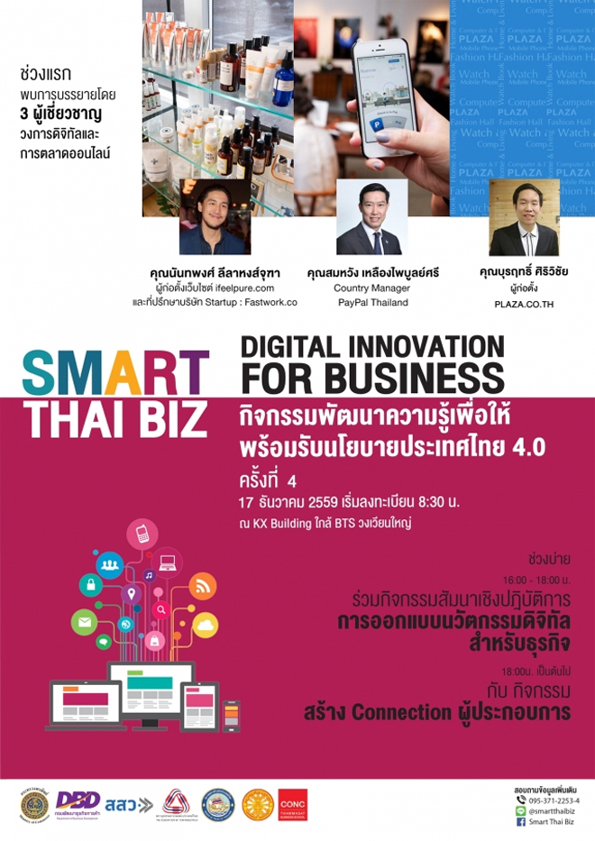 โอกาสดีๆที่ไม่ควรพลาด!!! หากคุณเป็นผู้ประกอบการ SMEs ที่ต้องการปรับธุรกิจให้ดีขึ้นกว่าเดิมแต่ไม่รู้จะเริ่มที่ตรงไหน อย่าพลาดโครงการ Smart Thai Biz โครงการดีๆที่จะช่วยสร้าง “นวัตกรรมเปลี่ยนความคิด เปลี่ยนโมเดลธุรกิจ พิชิตตลาดใหม่” โดยกรมพัฒนาธุรกิจการค้า (DBD) และ ม.ธรรมศาสตร์ โดยผู้ประกอบการจะได้รับสิทธิประโยชน์ต่างๆ มากมาย เช่น