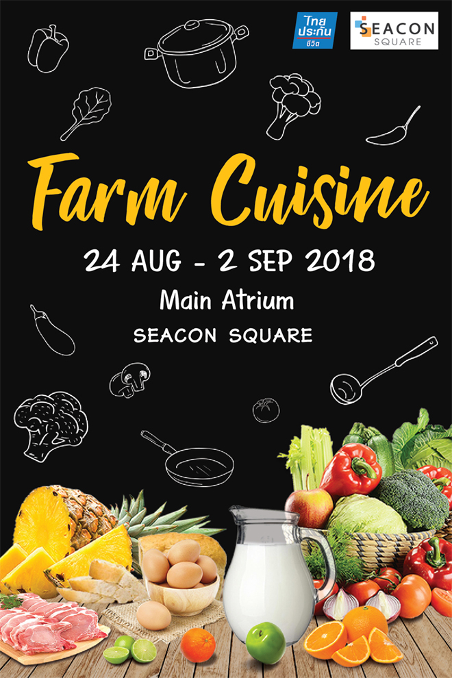 นาง รัชนี ปรีดากมลรัตน์ ผู้จัดการฝ่ายกิจกรรมการตลาด ศูนย์สรรพสินค้าซีคอนสแควร์ ถนน ศรีนครินทร์ เปิดเผยว่า บริษัทฯ ร่วมกับ ไทยประกันชีวิต จัดงาน “Farm Cuisine” ระหว่างวันที่ 24 สิงหาคม – 2 กันยายน 2561 ณ Main Atrium ชั้น 1 ศูนย์สรรพสินค้าซีคอนสแควร์ ถนนศรีนครินทร์