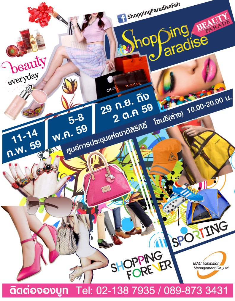 Shopping Paradise & Beauty Parade จึงรวบรวมสินค้าคุณภาพมาตอบโจทย์แก่นักช้อปผู้ฉลาดเลือก ฉลาดซื้อ และมีรสนิยม โดยเน้นสินค้าและราคาที่ส่งตรงจากกลุ่มผู้ผลิต, Young Designer, Import-Export Brand ในราคาสุดคุ้มกับคุณภาพ ให้คุณมั่นใจได้ว่า คุณได้สินค้าดีราคาเด็ดโดยไม่ต้องลังเล เพลิดเพลินเหมือนอยู่ในสวนสวรรค์แห่งการ Shopping
