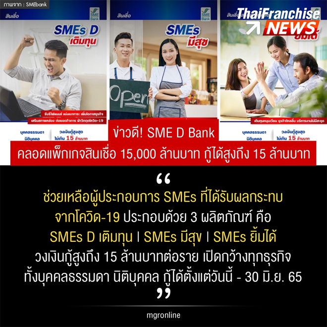 ช่วยเหลือผู้ประกอบการ SMEs ที่ได้รับผลกระทบ จากโควิด-19 ประกอบด้วย 3 ผลิตภัณฑ์ คือ SMEs D เติมทุน | SMEs มีสุข | SMEs ยิ้มได้ วงเงินกู้สูงถึง 15 ล้านบาทต่อราย เปิดกว้างทุกธุรกิจ ทั้งบุคคลธรรมดา นิติบุคคล กู้ได้ตั้งแต่วันนี้ – 30 มิ.ย. 65