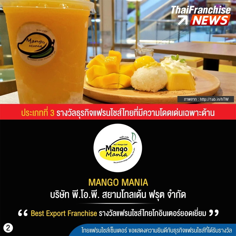 Best Export Franchise รางวัลแฟรนไชส์ไทยโกอินเตอร์ยอดเยี่ยม ได้แก่ บริษัท พี.โอ.พี.สยามโกลเด้น ฟรุต จำกัด เจ้าของแฟรนไชส์แมงโก้มาเนีย(MANGO MANIA)