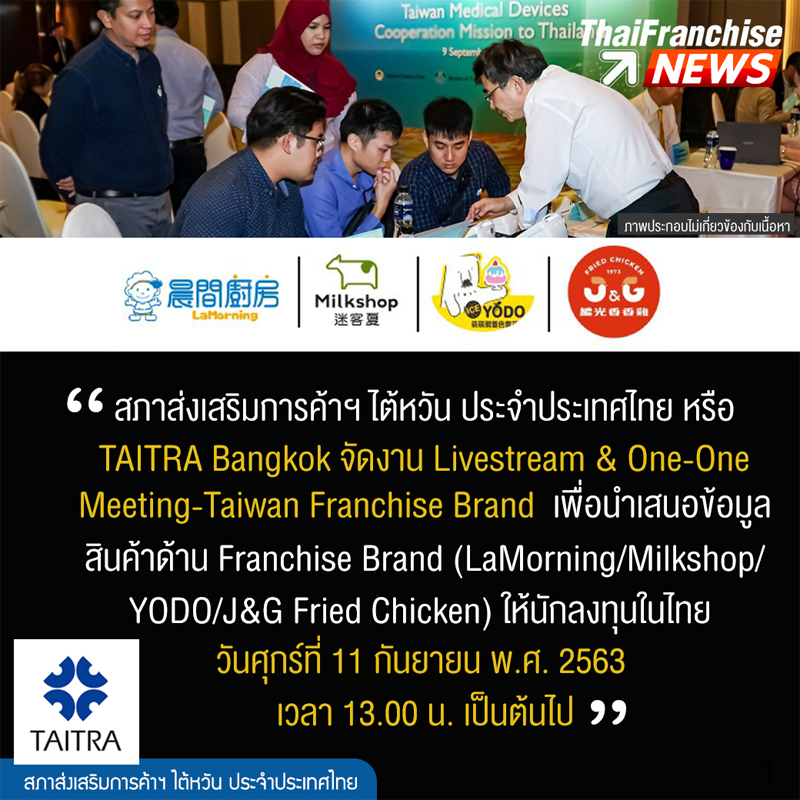 สภาส่งเสริมการค้าฯ ไต้หวัน ประจำประเทศไทย หรือ TAITRA Bangkok จัดงาน Livestream & One-One Meeting-Taiwan Franchise Brand เพื่อนำเสนอข้อมูลสินค้าด้าน Franchise Brand (LaMorning/ Milkshop/ YODO/ J&G Fried Chicken) ให้นักลงทุนในไทย วันศุกร์ที่ 11 กันยายน พ.ศ. 2563 เวลา 13.00 น. เป็นต้นไป