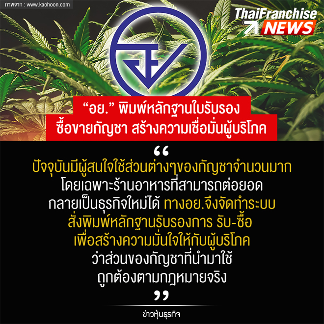 ปัจจุบันมีผู้สนใจใช้ส่วนต่างๆของกัญชาจำนวนมาก โดยเฉพาะร้านอาหารที่สามารถต่อยอดกลายเป็นธุรกิจใหม่ได้ ทาง อย. จึงจัดทำระบบสั่งพิมพ์หลักฐานรับรองการ รับ-ซื้อ เพื่อสร้างความมั่นใจให้กับผู้บริโภค ว่าส่วนของกัญชาที่นำมาใช้ถูกต้องตามกฎหมายจริง