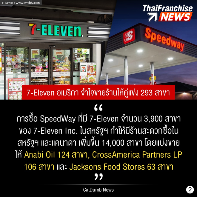 7-Eleven Inc. ในสหรัฐฯ ถูกคณะกรรมการด้านการค้า ให้ขายร้านสะดวกซื้อ 7-Eleven ในปั้มน้ำมันให้คู่แข่งจำนวน 293 สาขา เพื่อป้องกันการผูกขาดทางการค้า หลังจากทุ่มเงิน 668,000 ล้านบาท เข้าซื้อกิจการ Speedway ของบริษัท Marathon Petroleum Corp