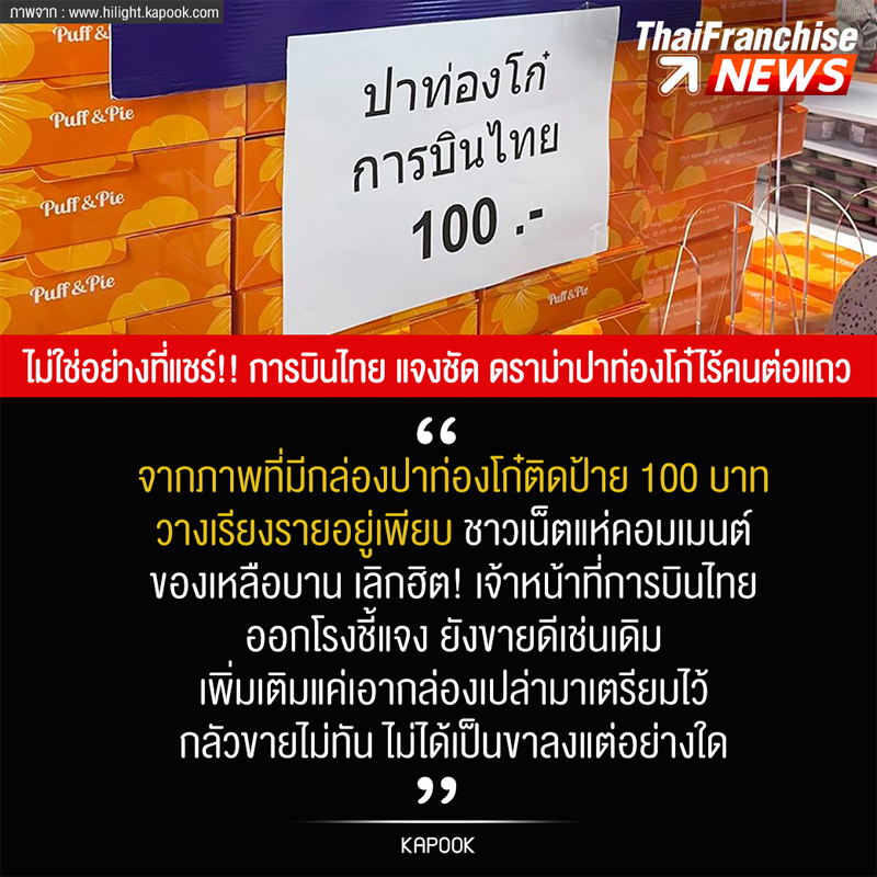 จากภาพที่มีกล่องปาท่องโก๋ติดป้าย 100 บาท วางเรียงรายอยู่เพียบ ชาวเน็ตแห่คอมเมนต์ ของเหลือบาน เลิกฮิต! เจ้าหน้าที่การบินไทย ออกโรงชี้แจง ยังขายดีเช่นเดิม เพิ่มเติมแค่เอากล่องเปล่ามาเตรียมไว้ กลัวขายไม่ทัน ไม่ได้เป็นขาลงแต่อย่างใด