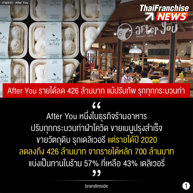 After You หนึ่งในธุรกิจร้านอาหาร ปรับทุกกระบวนท่าฝ่าโควิด ขายเมนูปรุงสำเร็จ ขายวัตถุดิบ รุกเดลิเวอรี แต่รายได้ปี 2020 ลดลงถึง 426 ล้านบาท จากรายได้หลัก 700 ล้านบาท แบ่งเป็นทานในร้าน 57% ที่เหลือ 43% เดลิเวอรี่