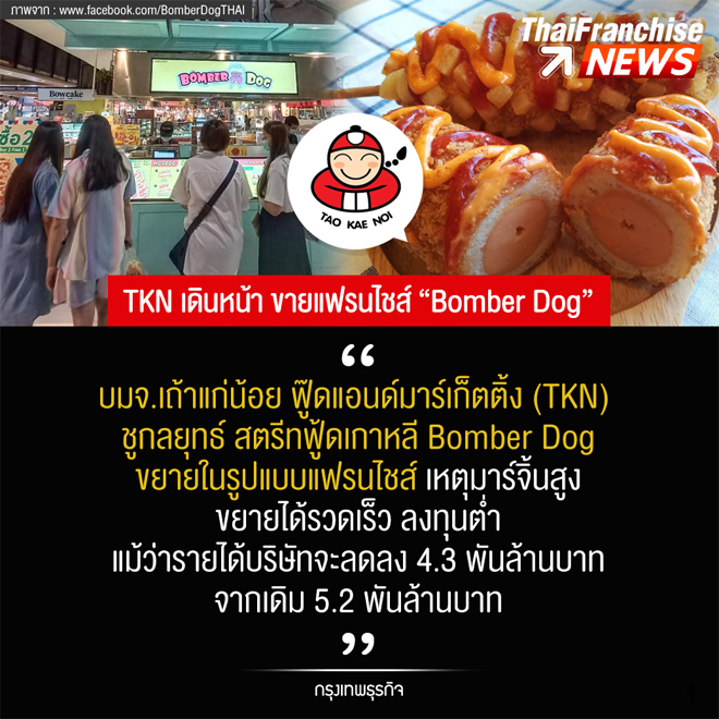 บมจ.เถ้าแก่น้อย ฟู๊ดแอนด์มาร์เก็ตติ้ง (TKN) ชูกลยุทธ์ สตรีทฟู้ดเกาหลี Bomber Dog ขยายในรูปแบบแฟรนไชส์ เหตุมาร์จิ้นสูง ขยายได้รวดเร็ว ลงทุนต่ำ แม้ว่ารายได้บริษัทจะลดลง 4.3 พันล้านบาท จากเดิม 5.2 พันล้านบาท